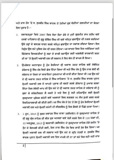 ਬਾਗੀ ਅਕਾਲੀ ਆਗੂਆਂ ਨੇ ਜਿਨ੍ਹਾਂ ਘਟਨਾਵਾਂ ਦਾ ਇਸ ਮਾਮਲੇ ਵਿੱਚ ਜ਼ਿਕਰ ਕੀਤਾ ਹੈ ਉਨ੍ਹਾਂ ਵਿੱਚ 2007 ਸੰਨ ਵਿੱਚ ਸਿਰਸਾ ਡੇਰੇ ਦੇ ਮੁਖ਼ੀ ਰਾਮ ਰਹੀਮ ਵੱਲੋਂ ਗੁਰੂ ਗੋਬਿੰਦ ਸਿੰਘ ਜੀ ਦੀ ਨਕਲ ਕਰਨ, 2015 ਵਿੱਚ ਡੇਰਾ ਮੁਖ਼ੀ ਦੇ ਹੁਕਮਾਂ ’ਤੇ ਕੀਤੀ ਗਈ ਸ੍ਰੀ ਗੁਰੂ ਗ੍ਰੰਥ ਸਾਹਿਬ ਦੀ ਬੇਅਦਬੀ ਅਤੇ ਡੇਰਾ ਮੁਖ਼ੀ ਦੇ ਇਸ਼ਾਰੇ ’ਤੇ ਕੀਤੀਆਂ ਹੋਰ ਸਿੱਖ ਵਿਰੋਧੀ ਘਟਨਾਵਾਂ ਸ਼ਾਮਲ ਹਨ। ਇਸ ਤੋਂ ਇਲਾਵਾ ਸੁਮੇਧ ਸੈਣੀ ਨੂੰ ਪੰਜਾਬ ਪੁਲਿਸ ਦਾ ਡੀ.ਜੀ.ਪੀ. ਲਗਾਏ ਜਾਣ ਦੇ ਫ਼ੈਸਲੇ ਨੂੰ ਵੀ ਗ਼ਲਤ ਦੱਸਿਆ ਗਿਆ।
