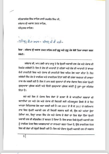 ਅਮ੍ਰਿੰਤਸਰ – ਸ਼੍ਰੋਮਣੀ ਅਕਾਲੀ ਦਲ ਦੇ ਬਾਗੀ ਧੜੇ ਦੇ ਆਗੂਆਂ ਨੇ ਨਵਾਂ ਪੈਂਤੜਾ ਅਖਤਿਆਰ ਕਰਦਿਆਂ ਸੋਮਵਾਰ ਨੂੰ ਸ੍ਰੀ ਹਰਿਮੰਦਰ ਸਾਹਿਬ ਕੰਪਲੈਕਸ ਵਿੱਚ ਸ੍ਰੀ ਅਕਾਲ ਤਖ਼ਤ ਸਾਹਿਬ ਦੇ ਜਥੇਦਾਰ ਸਨਮੁੱਖ ਹੋ ਕੇ ਪੰਜਾਬ ਵਿੱਚ ਪਾਰਟੀ ਦੇ 10 ਸਾਲਾਂ ਦੇ ਰਾਜ ਦੌਰਾਨ ਵਾਪਰੀਆਂ ਘਟਨਾਵਾਂ ਲਈ ਲਿਖਤੀ ਮੁਆਫ਼ੀ ਮੰਗੀ ਹੈ।