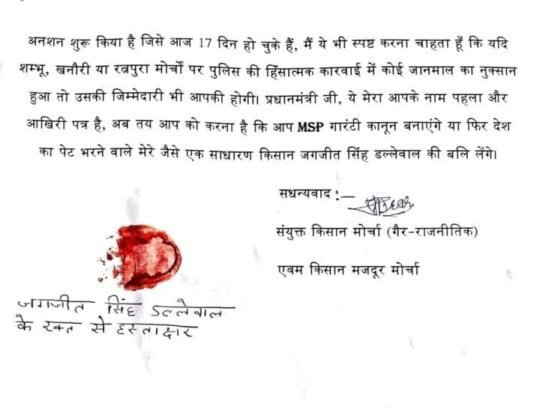 ਅੰਤ ਵਿੱਚ ਡੱਲੇਵਾਲ ਨੇ ਪੱਤਰ ‘ਚ ਇਸ਼ਾਰਾ ਕੀਤਾ ਹੈ ਕਿ ਜੇਕਰ ਕੁਝ ਹੋਰ ਸਮੇਂ ਤੱਕ ਮੰਗਾਂ ਨਹੀਂ ਮੰਨੀ ਗਈਆਂ ਤਾਂ ਉਹ ਆਪਣੀ ਜਾਨ ਦੀ ਕੁਰਬਾਨੀ ਦੇਣ ਨੂੰ ਵੀ ਤਿਆਰ ਹਨ।
