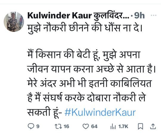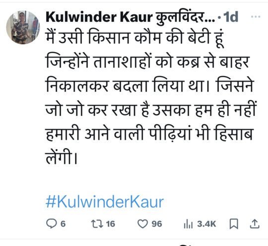 ਕੁਲਵਿੰਦਰ ਕੌਰ ਨੇ ਆਪਣੇ ‘X’ ਅਕਾਂਊਟ ‘ਤੇ ਲਿਖਿਆ ਹੈ, “ ਮੈਂ ਉਸ ਕਿਸਾਨ ਕੌਮ ਦੀ ਧੀ ਹਾਂ ਜਿਸਨੇ ਤਾਨਾਸ਼ਾਹੀ ਨੂੰ ਕਬਰ ਵਿੱਚੋਂ ਬਾਹਰ ਕੱਡ ਕੇ ਬਦਲਾ ਲਿਆ ਸੀ,ਜਿਸਨੇ ਜੋ ਜੋ ਕੀਤਾ ਹੈ ਉਸ ਦਾ ਅਸੀਂ ਹੀ ਨਹੀਂ ਸਾਡੀਆਂ ਆਉਣ ਵਾਲੀਆਂ ਪੀੜ੍ਹੀਆਂ ਵੀ ਬਦਲਾ ਲੈਣਗੀਆਂ।”
