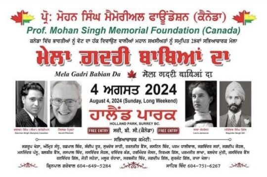 ਸਰੀ- ਕੈਨੇਡਾ ਦੀ ਧਰਤੀ ‘ਤੇ ਗਦਰੀ ਯੋਧਿਆਂ ਦੀ ਵਿਰਾਸਤ ਨੂੰ ਸੰਭਾਲੀ ਰੱਖਣ ਦੇ ਯਤਨਾਂ ਤਹਿਤ 28ਵਾਂ ‘ਮੇਲਾ ਗਦਰੀ ਬਾਬਿਆਂ ਦਾ’ ਸਰੀ ਸ਼ਹਿਰ ਵਿੱਚ ਕਰਵਾਇਆ ਜਾਏਗਾ। ਪ੍ਰੋਃ ਮੋਹਨ ਸਿੰਘ ਮੈਮੋਰੀਅਲ ਫ਼ਾਂਊਂਡੇਸ਼ਨ ਦੇ ਪ੍ਰਧਾਨ ਸਾਹਿਬ ਸਿੰਘ ਥਿੰਦ ਨੇ ਸ਼ਹਿਰ ਦੇ ਪਤਵੰਤੇ ਸੱਜਣਾਂ ਦੀ ਹਾਜ਼ਰੀ ਵਿੱਚ ਮੇਲੇ ਨਾਲ ਸਬੰਧਿਤ ਪੋਸਟਰ ਜਾਰੀ ਕਰਨ ਮੌਕੇ ਦੱਸਿਆ ਕਿ ਇਹ ਮੇਲਾ 4 ਅਗਸਤ ਨੂੰ ਸਰੀ ਦੇ ਹਾਲੈਂਡ ਪਾਰਕ ਵਿੱਚ ਕਰਵਾਇਆ ਜਾਏਗਾ । ਇਸ ਵਾਰ ਦਾ ‘ਮੇਲਾ ਗਦਰੀ ਬਾਬਿਆਂ ਦਾ’ ਕੈਨੇਡਾ ਵਿੱਚ ਭਾਰਤੀਆਂ ਨੂੰ ਵੋਟ ਦਾ ਹੱਕ ਦਿਵਾਉਣ ਲਈ ਸੰਘਰਸ਼ ਕਰਨ ਵਾਲੀਆਂ ਚਾਰ ਪ੍ਰਮੁੱਖ ਸਖ਼ਸ਼ੀਅਤਾਂ ਨੂੰ ਸਮਰਪਿਤ ਹੋਵੇਗਾ।