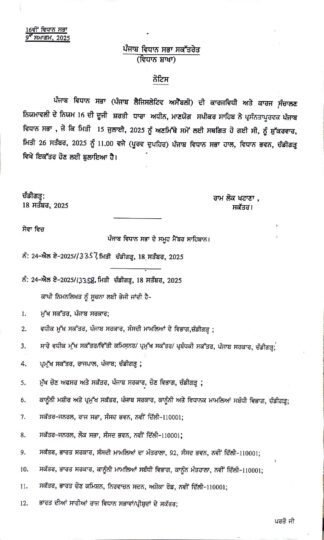 ਚੰਡੀਗੜ੍ਹ- ਪੰਜਾਬ ਵਿਧਾਨ ਸਭਾ ਦਾ ਚਾਰ ਦਿਨਾ ਵਿਸ਼ੇਸ਼ ਇਜਲਾਸ ਬੁਲਾਇਆ ਗਿਆ ਹੈ । ਪੰਜਾਬ ਦੇ ਮੁੱਖ ਮੰਤਰੀ ਭਗਵੰਤ ਮਾਨ ਨੇ ਕਿਹਾ ਕਿ ਪੰਜਾਬ ਵਿੱਚ ਹੜ੍ਹਾਂ ਨਾਲ ਹੋਈ ਤਬਾਹੀ ਦੇ ਮੱਦੇਨਜ਼ਰ ਕੁੱਝ ਨਿਯਮਾਂ ਵਿੱਚ ਸੋਧਾਂ ਕਰਨ ਤੇ ਨਾਲ ਹੀ ਮੁਆਵਜ਼ੇ ਸੰਬੰਧਿਤ ਕੁੱਝ ਨਵੇਂ ਕਾਨੂੰਨਾਂ ਨੂੰ ਮਾਨਤਾ ਦੇਣ ਲਈ 26 ਸਤੰਬਰ ਤੋਂ 29 ਸਤੰਬਰ ਤੱਕ ਪੰਜਾਬ ਵਿਧਾਨ ਸਭਾ ਦਾ ਵਿਸ਼ੇਸ਼ ਸੈਸ਼ਨ ਸੱਦਿਆ ਗਿਆ ਹੈ ।