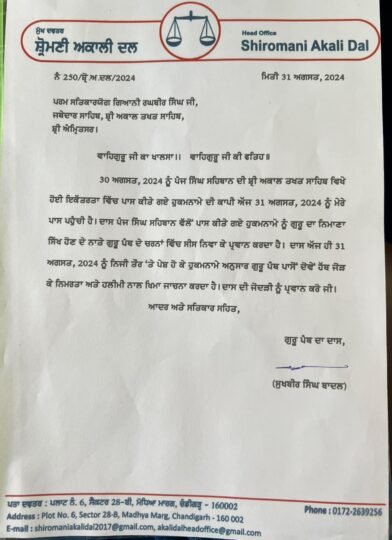 “ਅੱਜ ਸ੍ਰੀ ਅਕਾਲ ਤਖ਼ਤ ਸਾਹਿਬ ਦੇ ਸਕੱਤਰੇਤ ਵਿਖੇ ਨਿੱਜੀ ਤੌਰ ਤੇ ਪੇਸ਼ ਹੋ ਕੇ ਦਿੱਤੇ ਸਮਰਪਣ ਪੱਤਰ ਦੀ ਕਾਪੀ ਹੇਠ ਨੱਥੀ ਹੈ।”