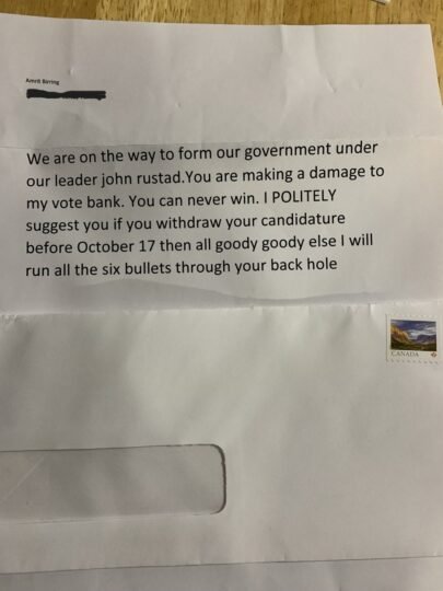 ਚਿੱਠੀ ਰਾਂਹੀ ਮਿਲੀ ਅਜਿਹੀ ਧਮਕੀ ਨੂੰ ਗੰਭੀਰਤਾ ਨਾਲ ਲੈਂਦਿਆਂ ਉਨ੍ਹਾਂ ਇਸ ਬਾਬਤ ਸਰੀ RCMP ਕੋਲ ਸ਼ਿਕਾਇਤ ਦਰਜ ਕਰਵਾ ਦਿੱਤੀ ਹੈ। ਸਰੀ-ਨਿਊਟਨ ਹਲਕੇ ਤੋਂ ਕੰਜ਼ਰਵੇਟਿਵ ਪਾਰਟੀ ਦੀ ਟਿਕਟ ‘ਤੇ ਚੋਣ ਲੜ ਰਹੇ ਉਮੀਦਵਾਰ ਤੇਗਜੋਤ ਬੱਲ ਨੇ ਕਿਹਾ ਕਿ ਪੁਲਸ ਨੂੰ ਇਸ ਚਿੱਠੀ ਦੀ ਤਫ਼ਤੀਸ਼ ਕਰਕੇ ਸੱਚਾਈ ਜਲਦੀ ਲੋਕਾਂ ਸਾਹਮਣੇ ਲਿਆਉਣੀ ਚਾਹੀਦੀ ਹੈ।